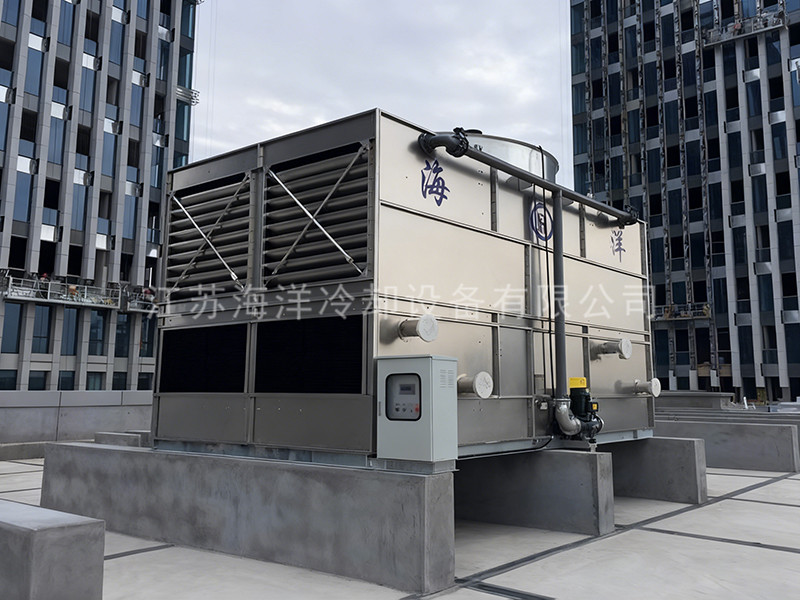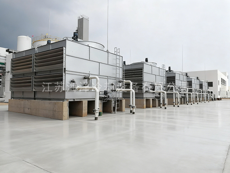 闭式冷却塔是蒸发冷却器的一种,是利用盘管外的喷淋水部分蒸发后吸收盘管内被冷却流体热量的一种设备。闭式冷却塔利用两级冷却方式即:一级冷却采用风冷,依靠风对冷却器盘管进行冷却;二级冷却采用风冷和喷淋,在环境温度比较高时使用二级冷却, 在风冷的同时喷淋系统将水淋到冷却器表面上,在水蒸发时能够带走盘管的热量,从而达到冷却效果。